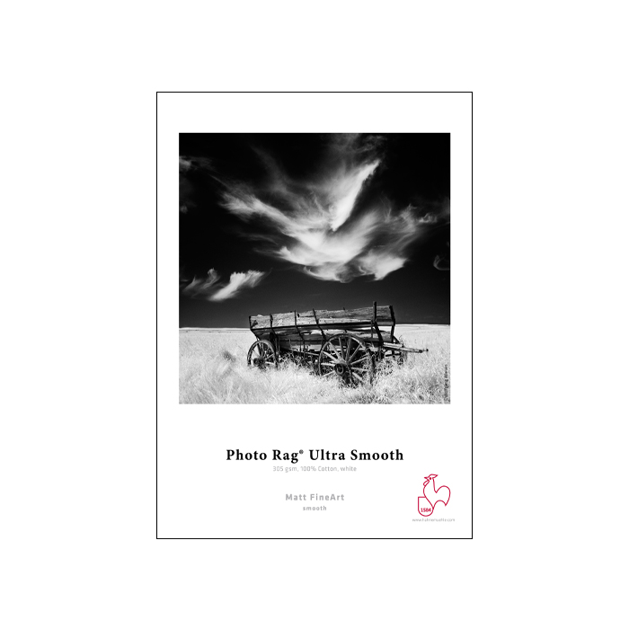 Photo Rag® Ultra Smooth, another addition to the Photo Rag® family, is an especially smooth and silky soft paper for high-quality FineArt inkjet printing. The white cotton art paper has a discreet, very finely textured surface with a strikingly silky feel. The matt premium inkjet coating guarantees extraordinary print results with impressive reproduction of colour, detail and very deep black. Photo Rag® Ultra Smooth is versatile and produces impressive results for FineArt photography as well as art reproductions. The acid- and lignin-free all-rounder meets the most exacting requirements in terms of age resistance and is perfect for high-quality black and white FineArt prints.