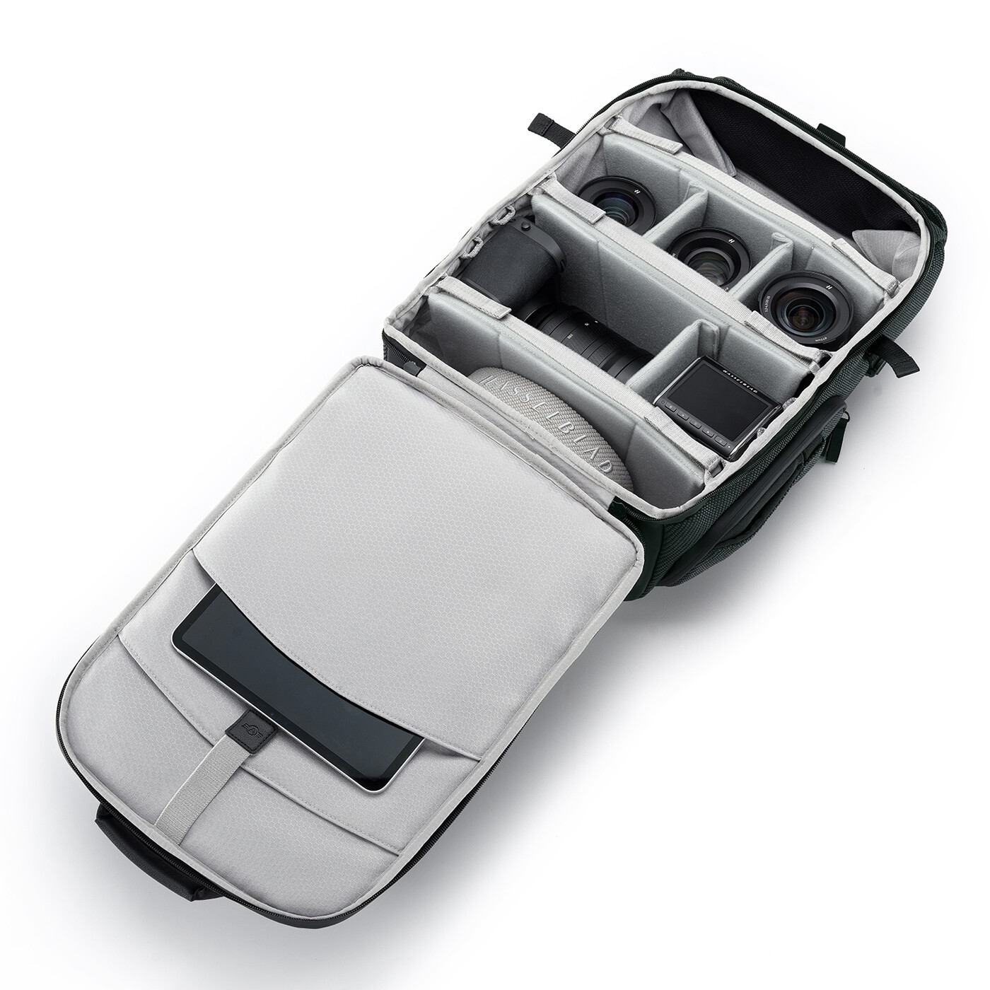 Med en kapacitet på ca. 20 liter rummer rygsækken et Hasselblad-kamera med to objektiver, samt bærbar computer, tablet og nødvendigt fototilbehør. Tre aftagelige skillevægge gør det muligt at tilpasse indretningen efter dine behov.