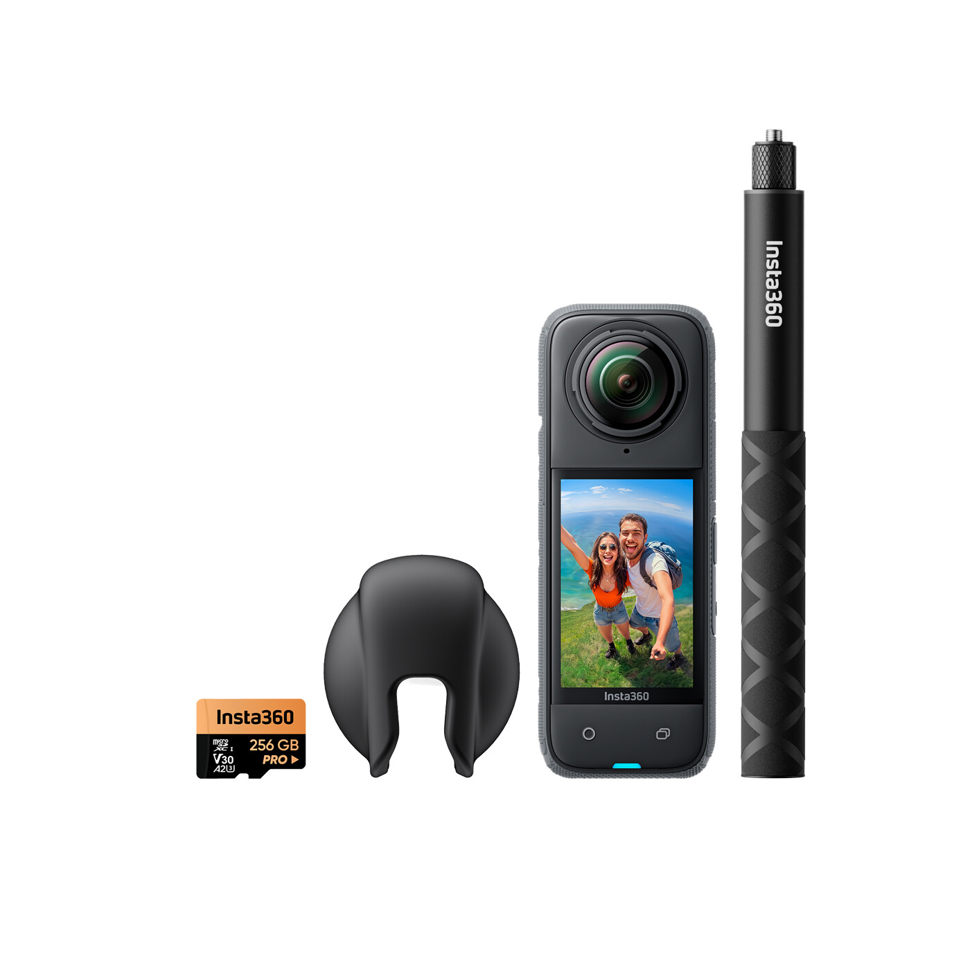 Den medfølgende 114 cm usynlige selfiestang hjælper dig med at skabe bredere og mere dynamiske optagelser, mens 256 GB hukommelseskortet giver dig masser af plads til videoer og fotos i høj opløsning. Objektivdækslet giver ekstra beskyttelse, når kameraet ikke er i brug.