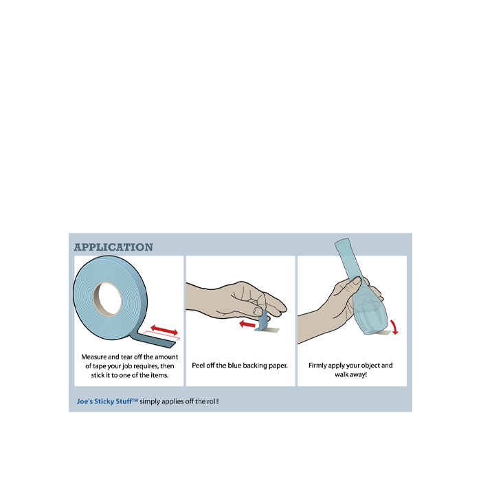 To apply Joe's Sticky Stuff simply tear off desired length, firmly place exposed tape onto surface of project and peel off backing paper. Joe's Sticky Stuff adheres very aggressively to some materials such as, but not limited to: paper, laminated plastics, plastic sheeting and certain wallpapers.