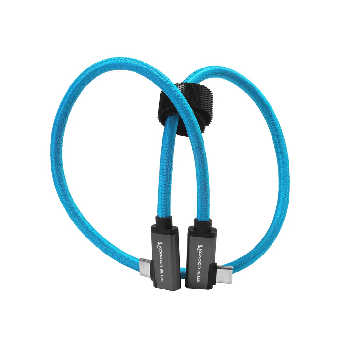 Kondor Blue's coiled right-angle USB-C to USB-C cable features 3.2, 20Gb/s 100W, 8K video data transfer, and charging capability. It's great for recording to an SSD using a Blackmagic (BMPCC4K/6K), Z CAM E2 (S6 F6 F8), Sigma fp, GH6, S5II, and Leica SL2s cameras.
