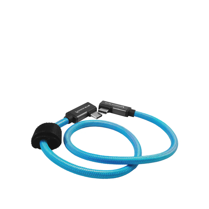 Kondor Blue's coiled right-angle USB-C to USB-C cable features 3.2, 10Gb/s 100W, 8K video data transfer, and charging capability. It's great for recording to an SSD when using a Blackmagic (BMPCC4K/6K), Z CAM E2 (S6 F6 F8), Sigma fp, GH6, S5II, or Leica SL2s cameras.