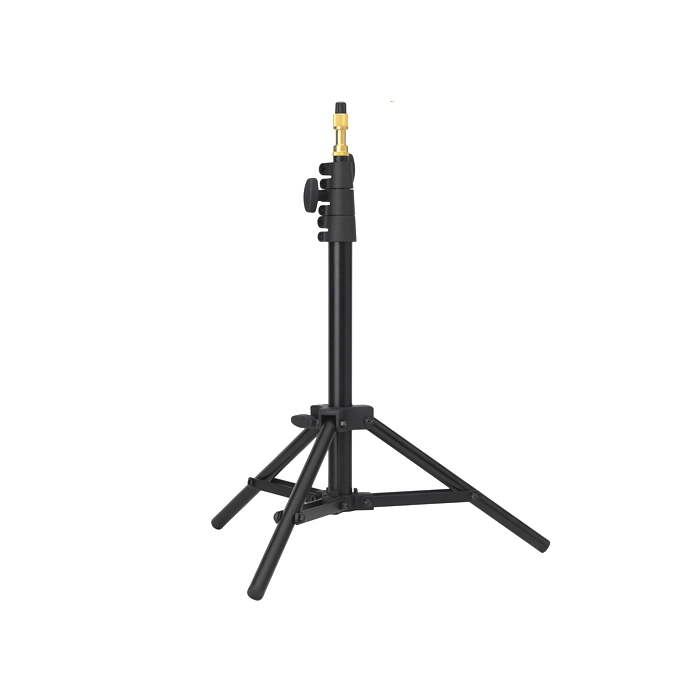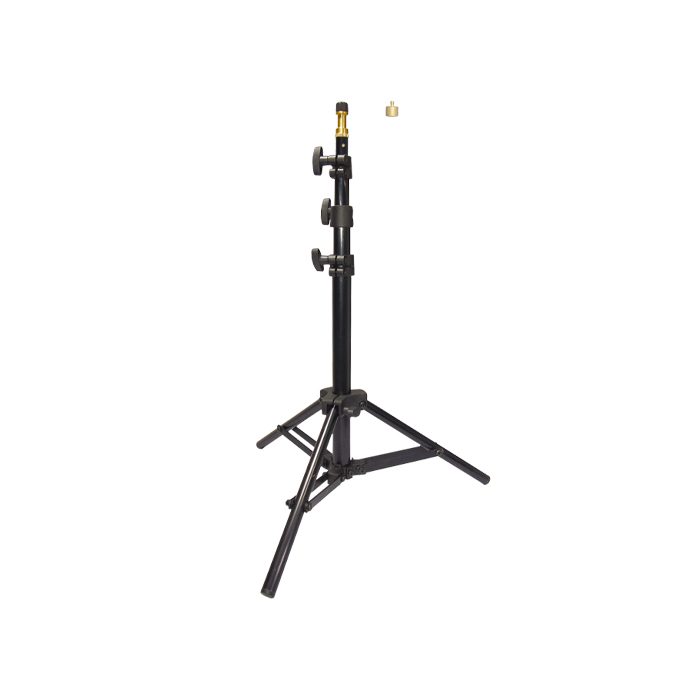 Low Mini Kit Stand kan bære op til 1,5 kg, har en standard 5/8" stift med 3/8"-16 gevind og leveres med 3/8"-16 hun til 1/4"-20 han-adapter.
