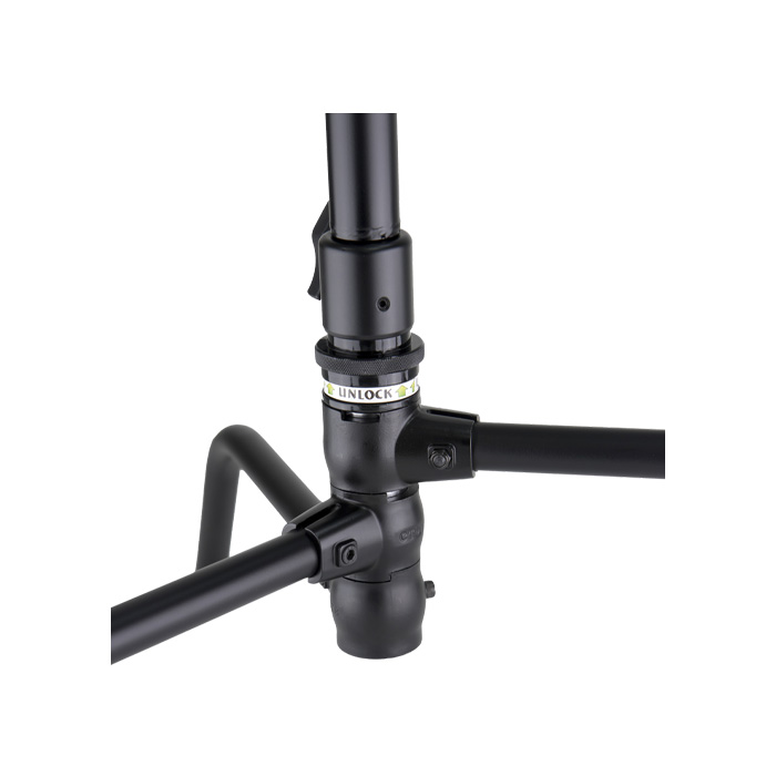 It features a zinc alloy base casting on that's five times stronger than aluminum to sustain the weight of heavy sandbags and people standing on it. The hollow junior pin receiver allows debris to pass through for easier cleaning and maintenance and the patented spring ring locking system enables you to open and close the base in under a second.