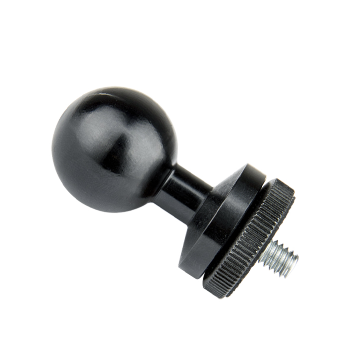 CNC aluminiumskugle ( dia. 26mm) med sort anodiseret finish. Den runde plade giver ekstra støtte og stabilitet til kameraer. Denne han-stud af stål med 1/4"-20 gevind passer til de fleste standardkameraer og videokameraer med hungevind, der findes på kameraets bund.