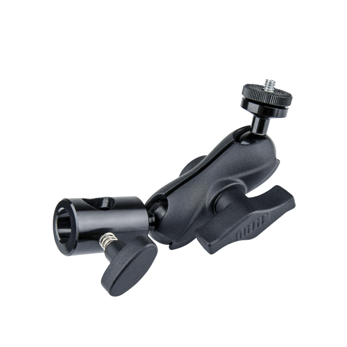 Holderen har en enkelt knap i midten til at spænde begge kugleled samtidigt med frihed til at positionere led i alle vinkler.