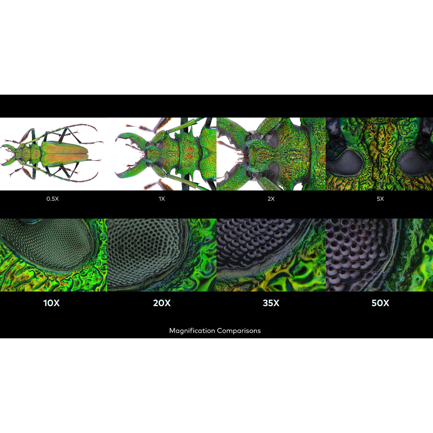 Oplev den skjulte skønhed med 10x, 20x, 35x og 50x forstørrelse. Objektivkroppen består af to dele: de udskiftelige forstørrelsesrør, som monteres på kameraet, og selve objektivet forrest. Når opsætningen er på plads, kan du nemt skifte forstørrelsesrørene uden behov for ny kalibrering.
