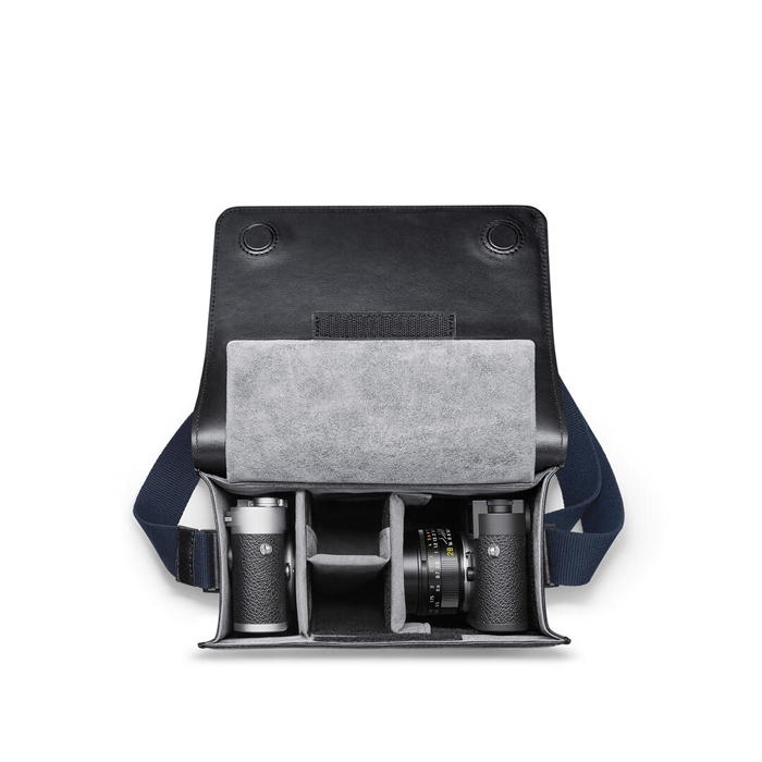The elegant camera bag made of high-quality black cowhide is ideal for stowing an Leica M camera and up to two lenses when out and about. Concealed magnetic closures on the flap lend it a stylish, discreet look, while shoulder padding on the navy-blue adjustable cotton strap ensures it’s comfortable to carry. The inside of the bag is made of grey micro suede and has an inner flap for additional protection of the equipment. Besides the camera and lenses, there is also room for a mini tablet at the back of the bag.
