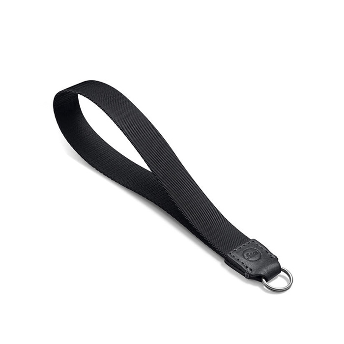 Wrist strap made of a material mix, vegetable-tanned black leather and soft woven fabric. 20cm long from the ring to the end of the loop. The width of the wrist strap is 2 cm. The wrist strap is supplied with a protective flap for the camera body. The strap comes in an elegant black colour.