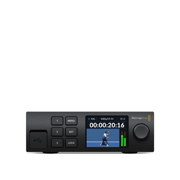 Blackmagic Bi-directional 2110 IP Converter 3x3G lets you convert SDI to IP and at the same time IP to SDI. That’s because its 10G Ethernet connection can handle 3 separate video channels simultaneously. Plus each channel has independent SDI inputs and SDI outputs, so you could even connect to 6 completely different SDI devices. All 3G-SDI inputs feature loop outputs so you can install the converter in line within existing SDI systems. There's also a reference output, timed to the 2110 PTP clock. Blackmagic 2110 IP Converter 3x3G includes an elegant front panel with a color LCD for monitoring, menus and diagnostics. You can even route IP inputs from the panel.