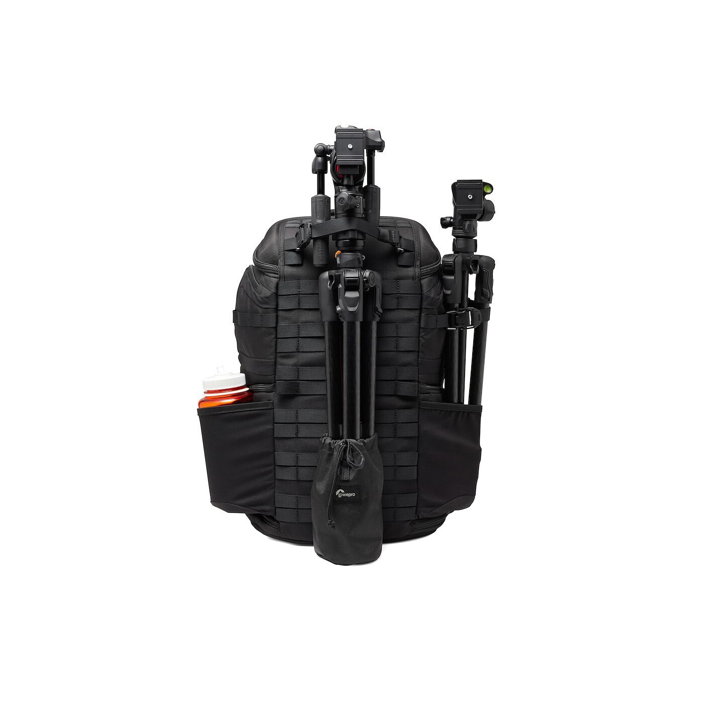Yderligere stropper og lommer øverst på siderne giver hurtig adgang og sikker fastgørelse af stativ. Rygsækken står stabilt selv, hvilket gør det nemt at håndtere og få adgang til udstyret.