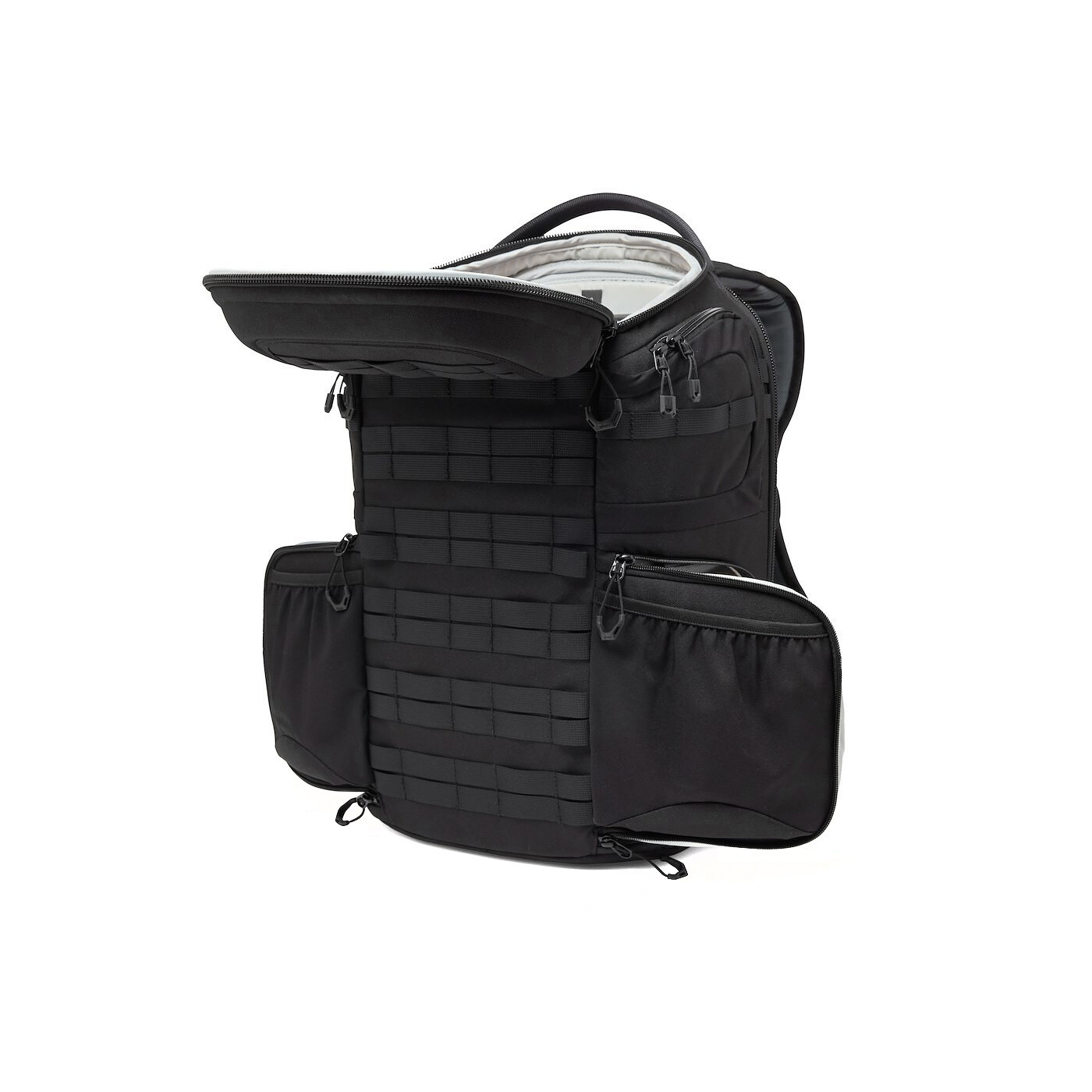 Indvendigt bag bagdøren finder du gennemsigtige lynlåslommer til organisering samt en CradleFit-lomme til laptop, der passer til op til en 16'' MacBook Pro. Sidelommerne har store ydre stræklommer, der kan rumme op til en 1L-flaske og er forstærket i bunden til stativstøtte.