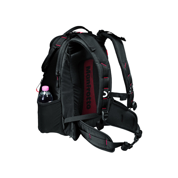 Photo gear may also be accessed from a convenient, zippered compartment on the top of the pack. This compartment is easily configured for storing items requiring quick access. Stay hydrated with the elastic water bottle pocket on the side of the pack, or store the base of a tripod inside the zippered pocket on the opposite side.