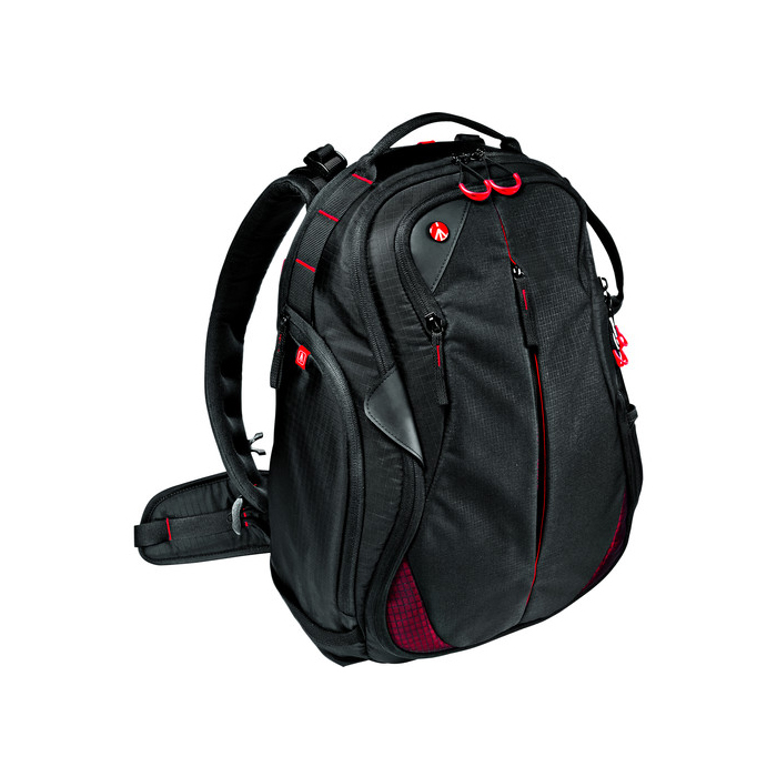 Innovative and sleek, the black Pro Light Bumblebee-130 Camera Backpack from Manfrotto is designed to store, protect, and transport your DSLR with attached 70-200mm f/2.8 lens, up to 8 additional lenses, and related accessories. There's also a zippered, padded, rear compartment for an up to 15" laptop.