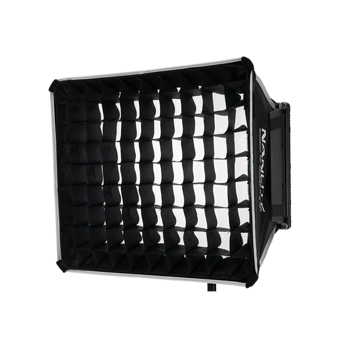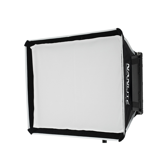 The Nanlite Barndoor and Softbox Set for MixPad II 27C RGBWW LED Panel Light. The softbox mounts via the barndoor to the front of the light fixture to soften light output. Folds flat for easy storage and transport and includes fabric grids.