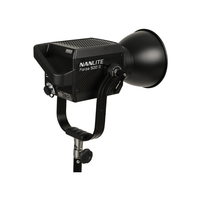 The Nanlite Forza 500 II LED Spotlight is exceptionally compact and lightweight yet delivers 92310 Lux (8576 fc) at 1 meter with the included reflector. It was made for professional production with durable construction, control options for Bluetooth, 2.4G, and DMX/RDM, a glass-protected COB, a fully redesigned yoke, and a Control Unit that can run on AC or side-mounted 26V or 14.4V-14.8V V-Mount batteries (sold separately). It has a highly accurate CRI rating of 96 and a TLCI of 97, and lets you easily adjust the green-to-magenta shift by +/- 80, which is made possible by its W(RG) LED source.