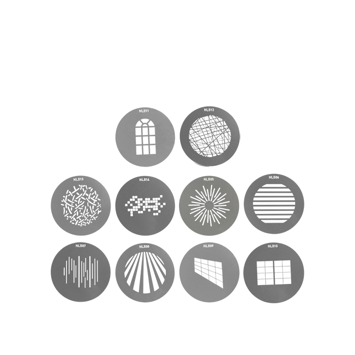 Nanlite Bowens Projection Attachment GOBO Set 1 is a collection of 10 gobo discs that are fully compatible with the PJ-BM Projection Attachment.