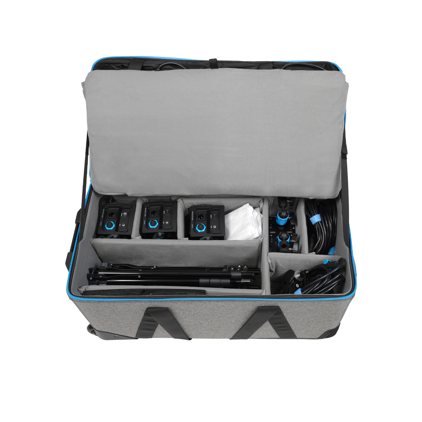 Denne bærbare lampe passer nemt ind i trange rum og kan hurtigt opsættes og tages ned. Konstruktionen er lavet af varmeafledende metal og fungerer uden blæser, hvilket sikrer mange års pålidelig brug. Den medfølgende pop-up softbox kan sættes op og pakkes væk på få sekunder.