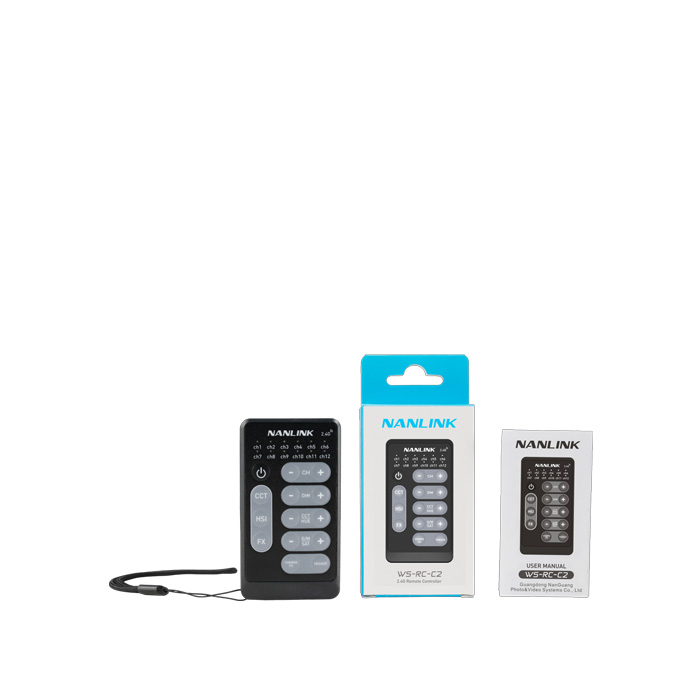 Nanlink WS-RC-C2 2.4GHz Remote Control er en trådløs multifunktionscontroller, der er designet til hurtige, enkle indstillingsjusteringer uden ledninger. Fjernbetjeningen kan justere lysstyrken, CCT, HUE og SAT-indstillingerne for NANLITE- og Nanlux-lys, der er udstyret med indbyggede 2,4 GHz-modtagere på op til 10 meters afstand.