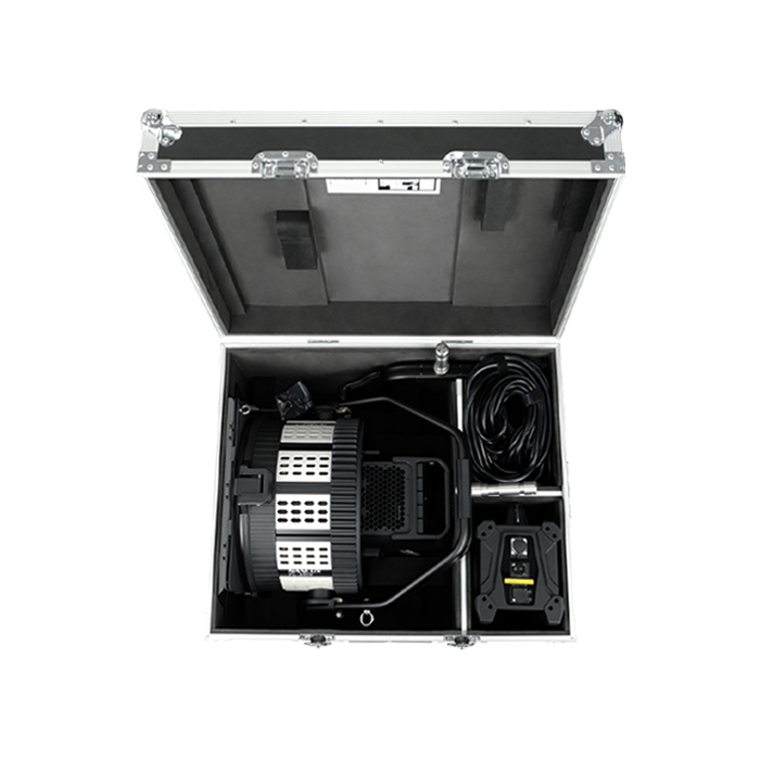 An efficiently sized case made of aluminum alloy die-casting, that is durable and impact-resistant. Providing space for one Evoke 1200 series fixture head, FL-35YK fresnel, power supply, power cable, yoke and 45º reflector.
