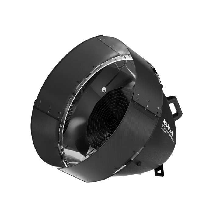 The NL70 parallel beam reflector features a beam angle of 6°. It is fitted with an internal grid design, and when combined with its snoot, it effectively reduces spill light, ensuring a focused and even light output. When used with compatible Evoke series light fixtures, it creates a cinema-grade parallel light beam.
