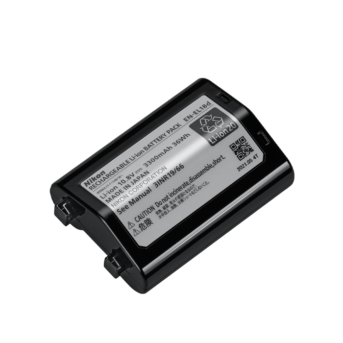 Det genopladelige EN-EL18d lithium-ion-batteri (10,8 V, 3300 mAh kapacitet) er designet til at drive udvalgte Nikon-kameraer. EN-EL18d skal oplades ved hjælp af MH-33 batterioplader.