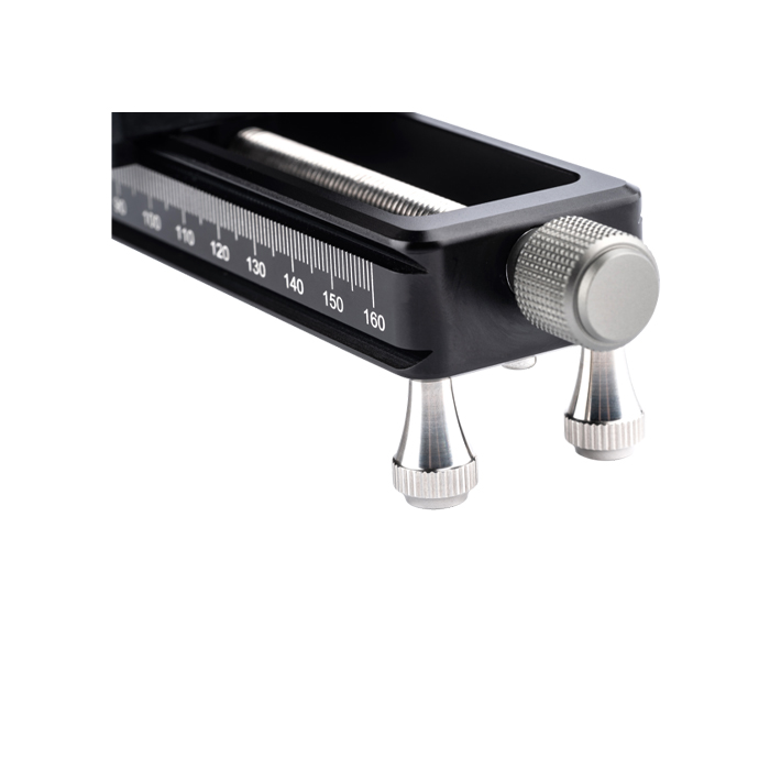 The rail is totally 180mm long and you can adjust distance of 160mm range. The rail itself is made in Arca-style, which makes it fit directly on a tripodhead with Arca-standard.