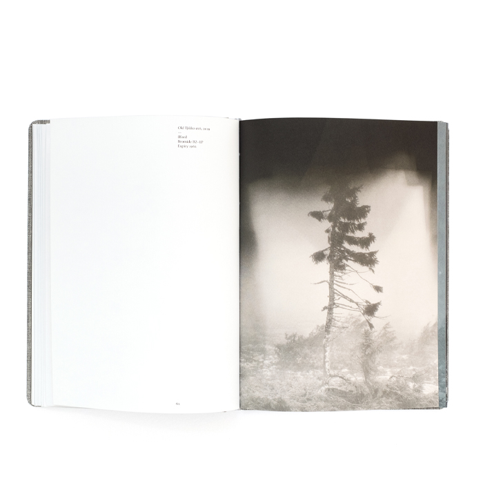 The tree, Old Tjikko, stands in a deserted landscape on a mountainside in Dalarna, Sweden, and is considered to be the oldest tree in the world with its impressive age of 9,600 years. A single photographic negative of this exceptional spruce has become the many different photographs in this book. By exposing the same image onto 97 different types of aged analogue light-sensitive photo papers – some dating back as far as the 1940’s – Nicolai Howalt has in Old Tjikko created a book, where the unpredictability of the long expired photographic papers has become an integral and dynamic part of each image.