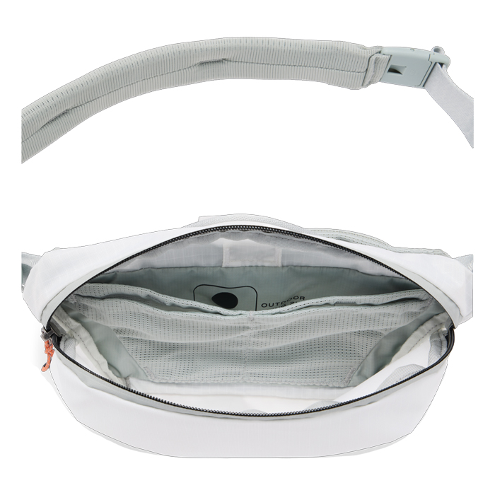 - Polstret, justerbar skulderrem, der kan indstilles til at bære på tværs af kroppen eller i taljen