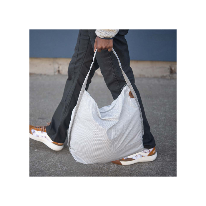 Den vejer kun 80 g (2,8 oz) og pakkes ned for så den kan komme ind i enhver lomme eller din hverdags taske. Den integrerede sæk til nedpakning af denne taske, fungerer også som en indvendig lomme, når du bruger tasken. Fair Trade-certificeret og 100% kulstofneutral.