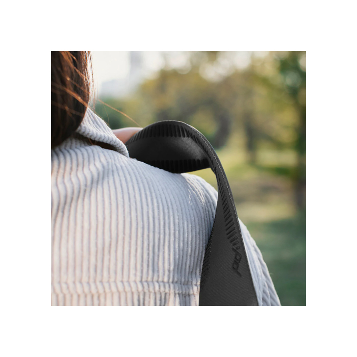 Den er komfortabel med en lav profil takket være nylonmaterialet med indvendig polstring. På den ene side er remmen glat og glider hen over tøjet uden at sidde fast. Vend det om, og silikonen griber fat og forhindrer, at remmen glider af skulderen.