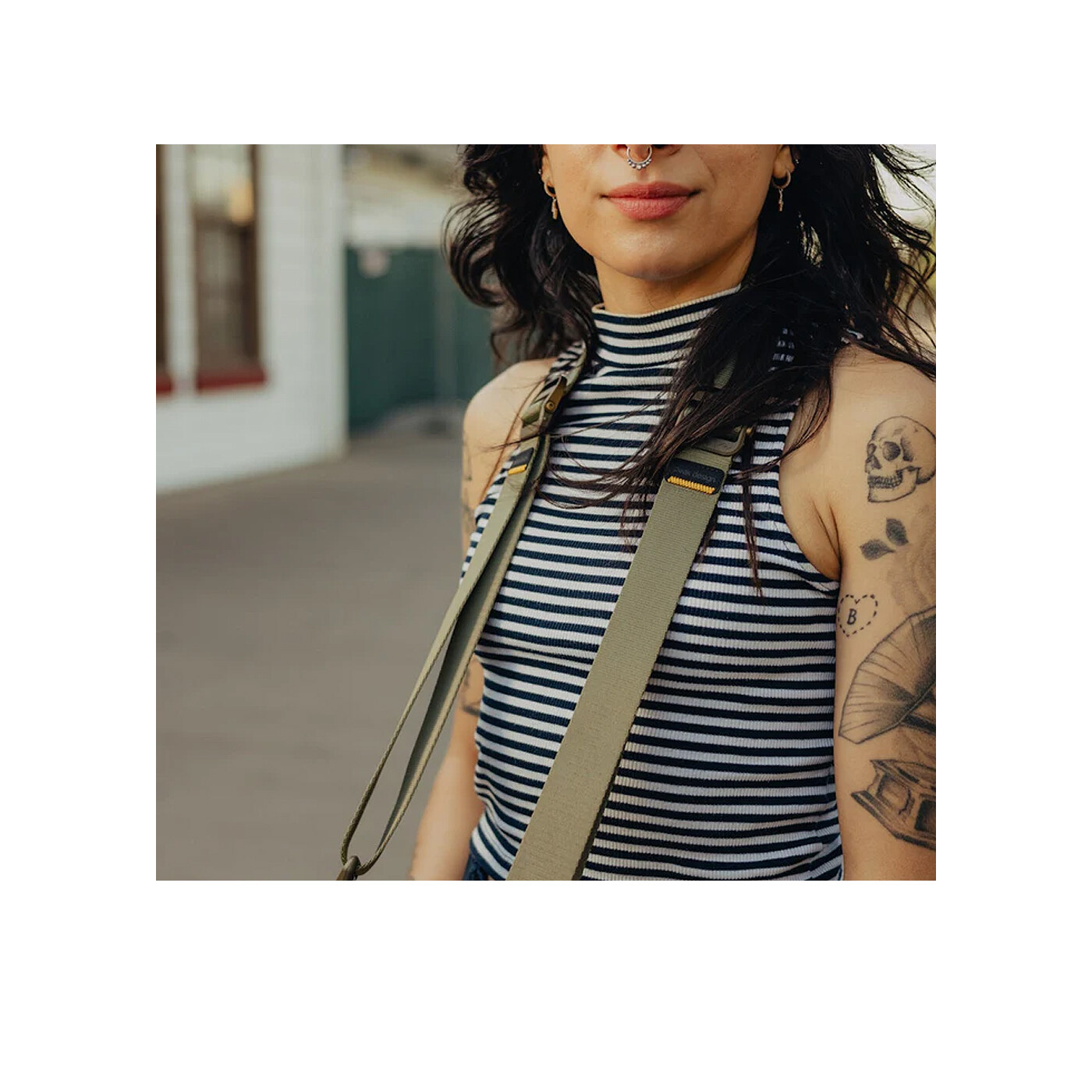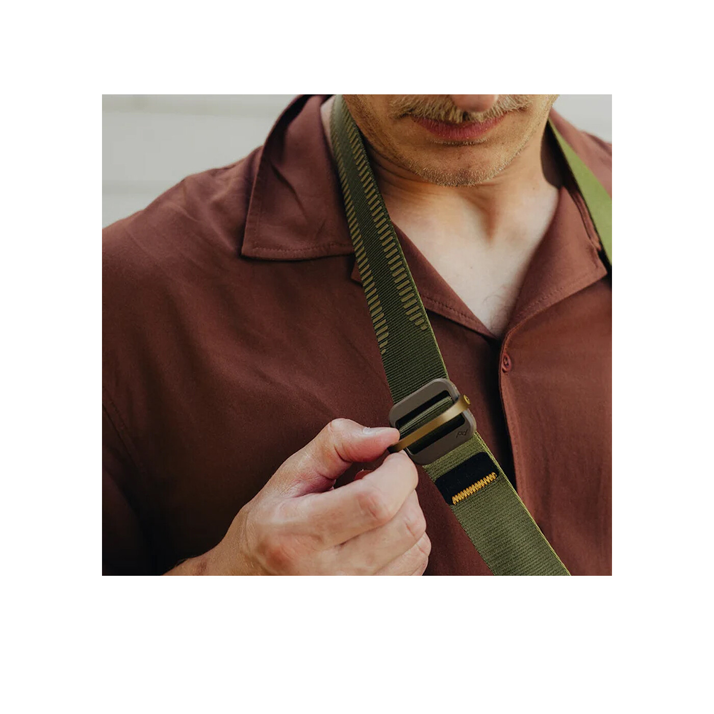 Remmen er fremstillet af seatbelt-style nylon webbing med to forskellige overflader: en glat side, der let glider over tøjet i sling-mode, og en skridsikker side, der forhindrer remmen i at glide af skulderen i shoulder-mode. Dobbelte quick-adjusters giver øjeblikkelig længdejustering og gør det nemt at tilpasse remmen til forskellige bærestile.