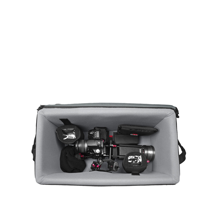 The compartment is empty and can be configured to meet your needs using Porta Brace's included 7 x 13" divider, Camera Tie-down Cinch and Camera Support Block (foam block).