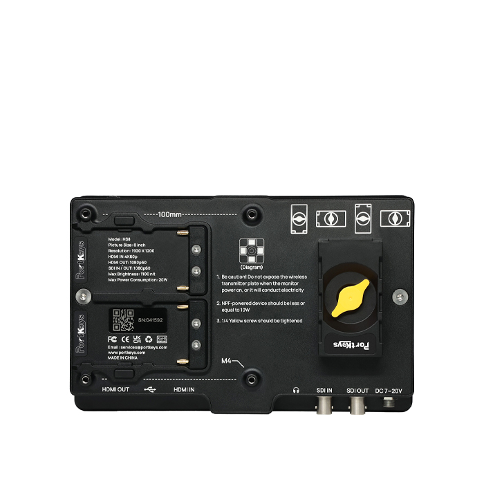 There are multiple ways to power the Portkeys HS8 monitor. Dual NP-F (Sony L series) battery compartment, as well as a screw-in DC port. The back also features a NPF H and V power supply system (patent design) that allows for mounting and supplying power to a wide range of wireless video transmitters.
