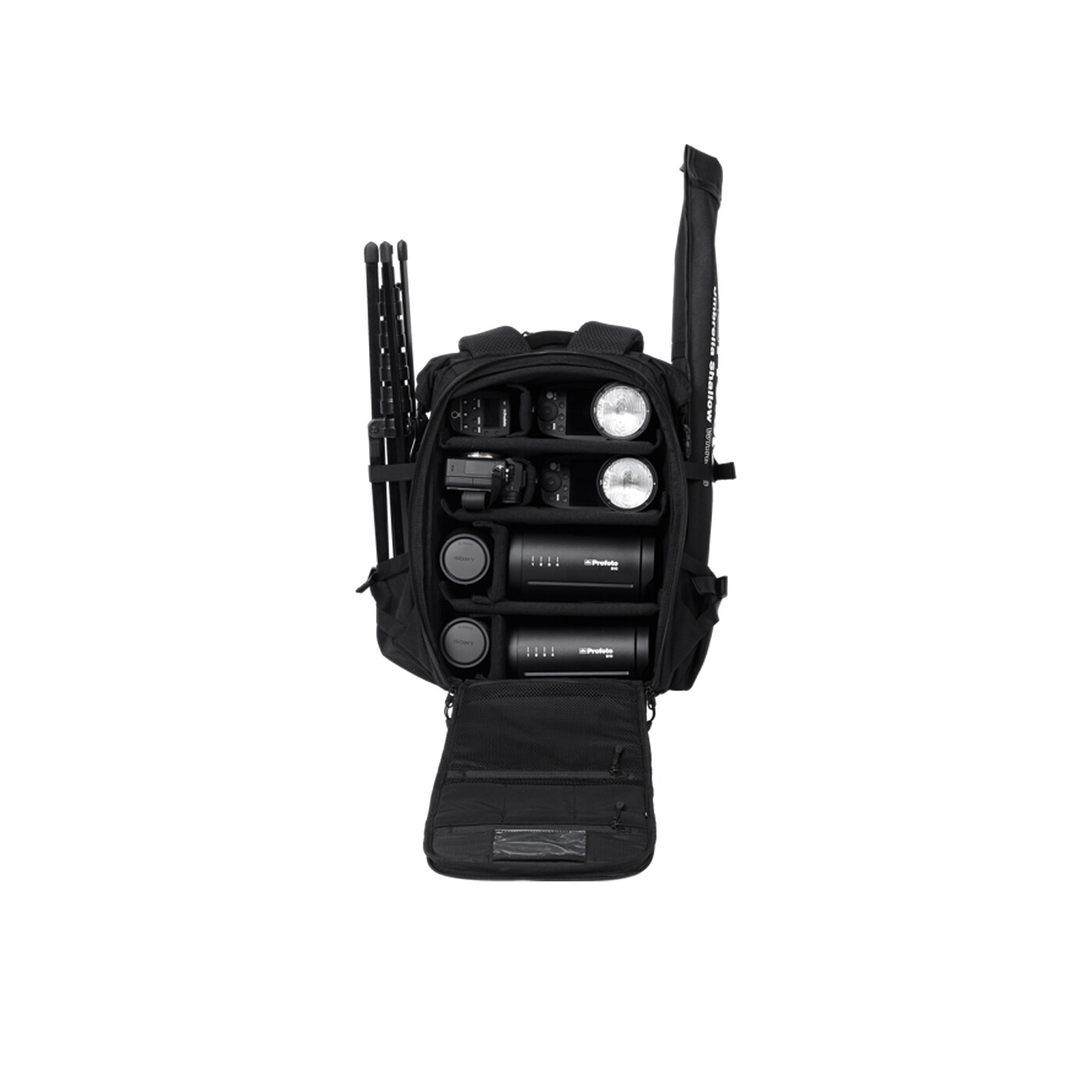 Et andet polstret rum på taskens front beskytter mindre og værdifulde genstande og inkluderer lommer til en 15” laptop, tablet og/eller dokumenter. Derudover er der adskillige små lommer til organisering af småting. På hver side er der lommer og stropper til at fastgøre kamera-tripods og mindre lysstativer. Et ærme til trolley-håndtaget er integreret i bagpanelet for at gøre rejser lettere. Designet af Profoto med materialer og hardware af allerhøjeste kvalitet.