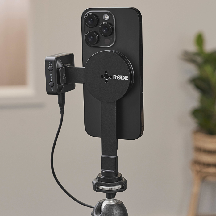 The Magnetic Mount is a versatile magnetic mounting system for attaching microphones, lights and other accessories to any MagSafe iPhone or other smartphone with a MagSafe-compatible case.