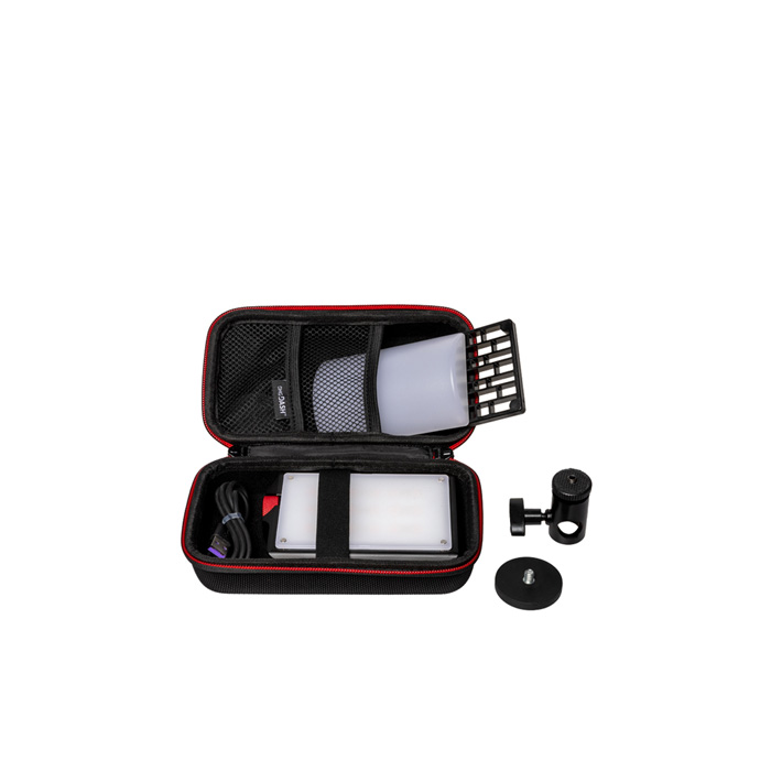 Hvert DMG DASH Pocket LED Kit leveres med et komplet sæt monterings- og magnetiske beam-shaping-tilbehør, samlet i en slidstærk transporttaske for nem opbevaring og transport