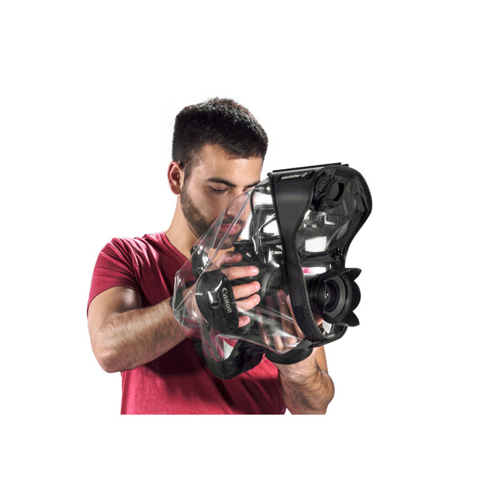 Regnslaget er hurtigt og nemt at installere, hvilket sikrer hurtig adgang til alle kamerafunktioner, mens du arbejder. En hotshoe-tilslutning i den forstærkede frontsektion giver en stabil og sikker fastgørelse på kameraet.