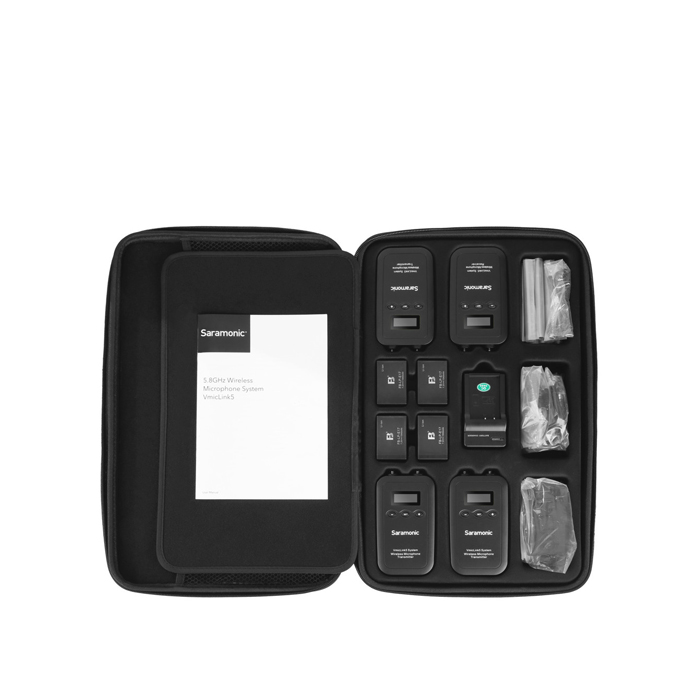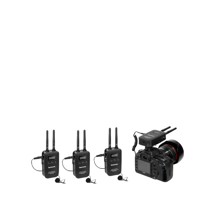 The Saramonic VmicLink5 TX+TX+TX+RX is a portable, three-channel, camera-mountable UHF wireless system that enables you to use clip-on lavalier mics on three separate people while only requiring you to attach a single compact receiver to your camera. This system is perfect for DSLR, mirrorless, video cameras or portable audio recorders for capturing interviews, event videography, film dialog, field recording, broadcast TV and news gathering.