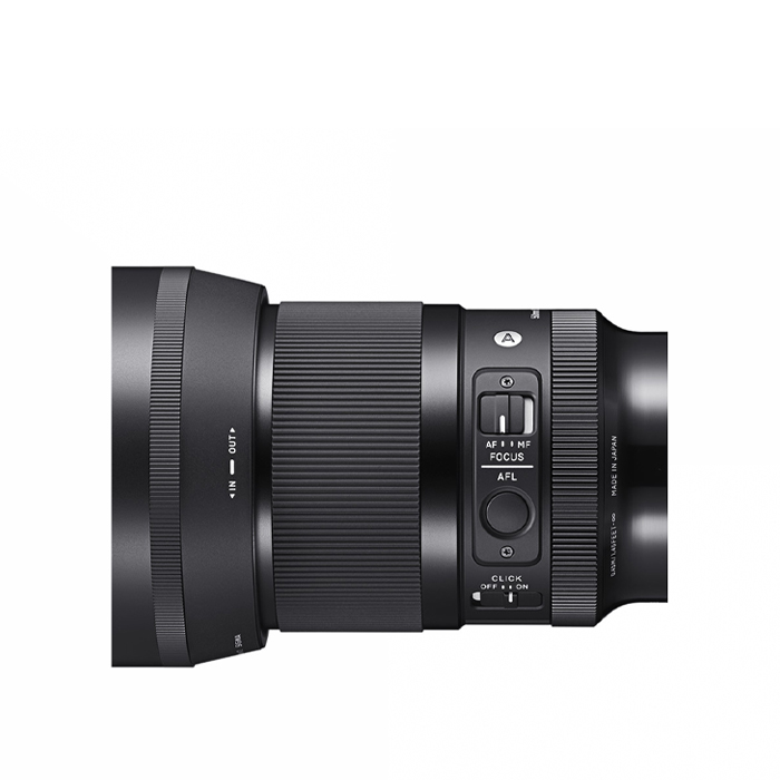 The lens barrel is equipped with a Focus Mode switch, an Aperture ring click switch to turn the click on and off, an Aperture ring lock switch to prevent unintended operation, and an AFL button to assign any function from the camera. These features are designed for intuitive operation during shooting.