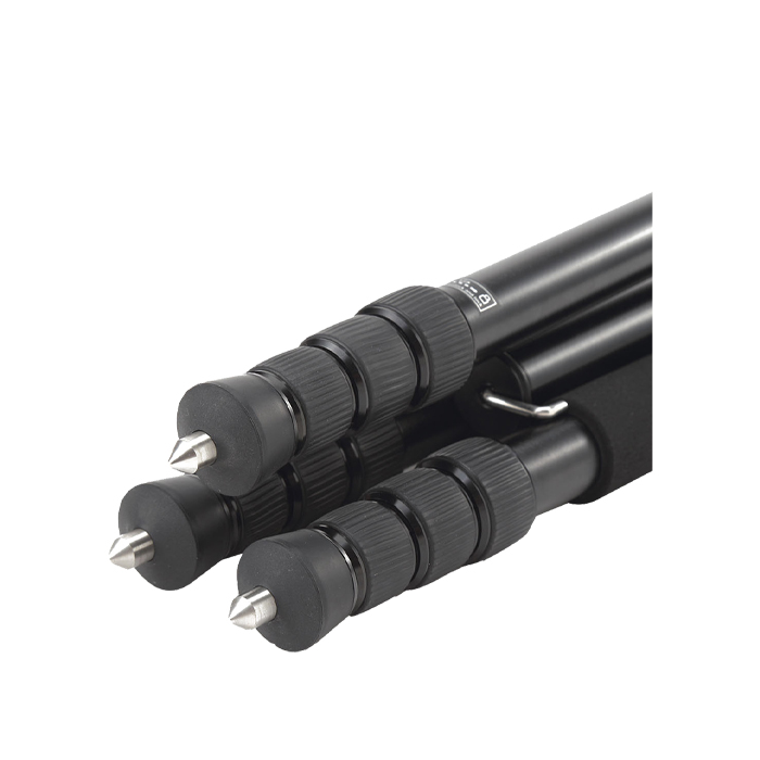 The tripod has 2 leg locking steps and thus stands especially safe. It is especially suitable for the studio and for working with larger cameras. A levelling bubble on the tripod cross allows an exact alignment of the tripod. Each leg consists of 4 sections with 3 sealed ring locks. Rubber feet and twist-out metal spikes allow the tripod to stand securely on any surface.