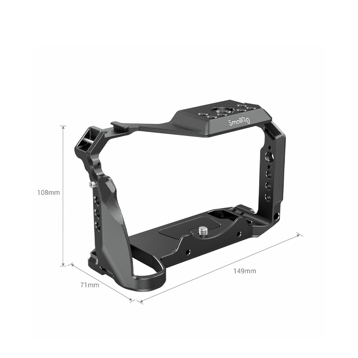 The cage secures to the camera via a 1/4”-20 screw on the bottom and an m2.5 screw on the right side for further security to prevent twisting. Featuring multiple 1/4”-20 and ARRI 3/8”-16 threads for accessories, such as Top Handle 2165 and Monitor Mount 2903.