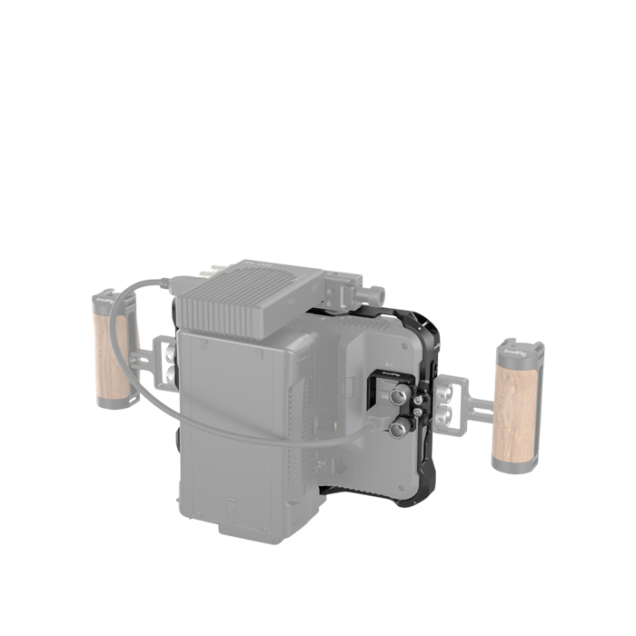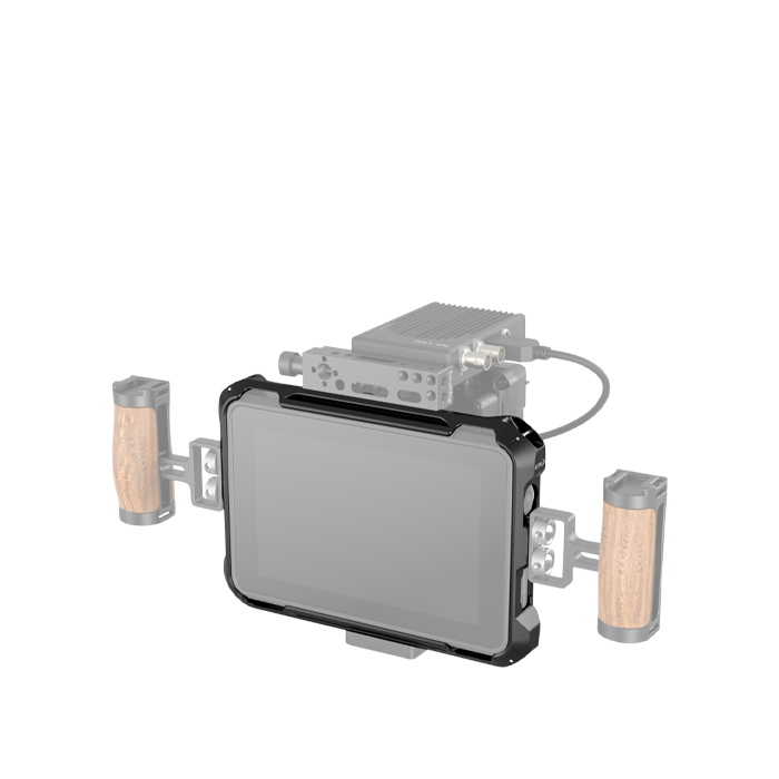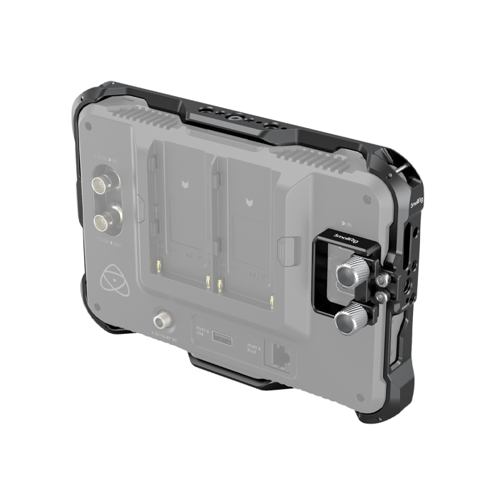 On the top for V-mount battery and wireless image transmitter. The cage allows mounting the original Atomos sun hood and Built-in sun hood on the top and bottom and features 1/4''-20, 3/8'-16 threaded holes on the side for a handle. Its cable clamp protects the monitor interface.