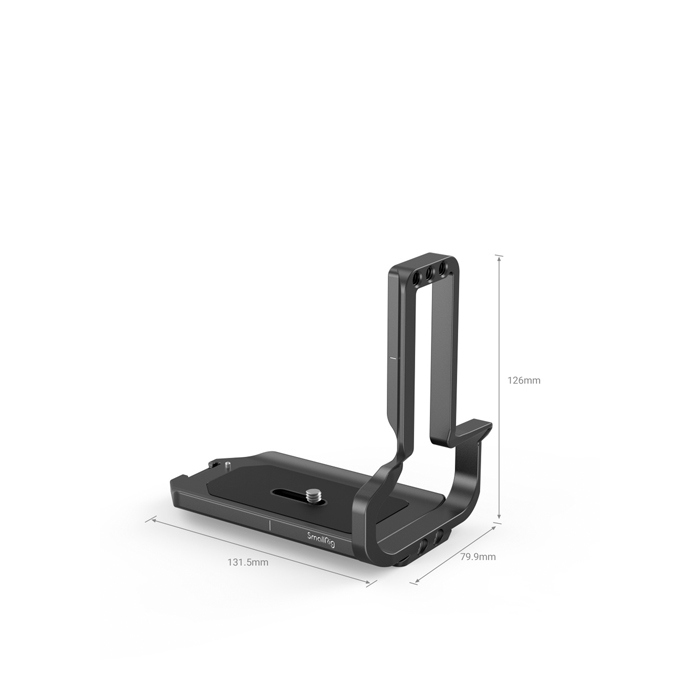 It is locked into the bottom of a camera via a 1/4"-20 screw and an anti-twist screw, fitted with a silicone pad to prevent scratches and deflection, and can be disassembled into an Arca-compatible base plate and side plate, both with lens center mark.