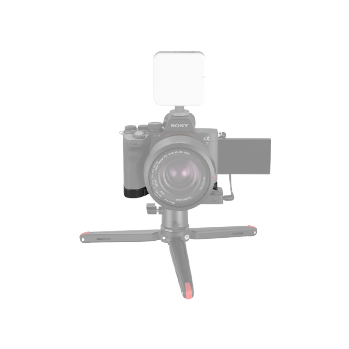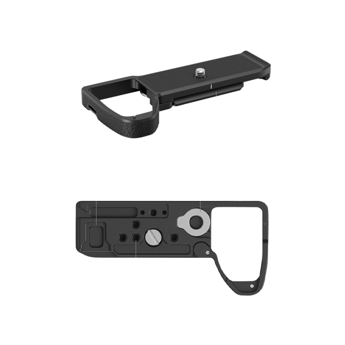 It attaches to the bottom of the camera via a 1/4" -20 screw and locating pin, with features built-in silicone pad to prevent scratches and twisting.