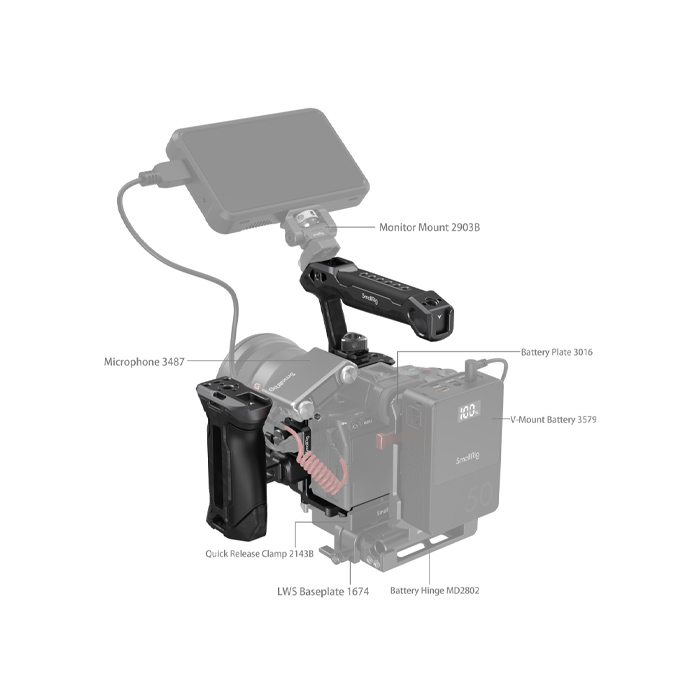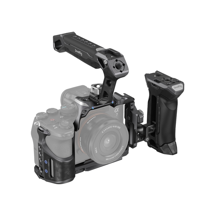 SmallRig "Rhinoceros" Advanced Cage Kit for Sony Alpha 7R V / Alpha 7 IV / Alpha 7S III 3710 is designed to reduce burdens on arms, increase stability, and provide accessory mounting points. The kit includes a cage, a top handle, a side handle, and an HDMI cable clamp.