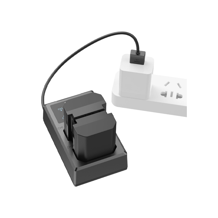Indeholder to batterier, en oplader og et ladekabel. Batteriet, der er udstyret med en fuld afkodningschip, understøtter forskellige kameraer perfekt og har brandsikker ABS- og PC-skal af høj kvalitet, der er matteret for at sikre fin berøring og holdbarhed.