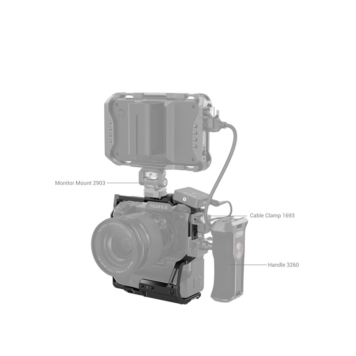 It comes with 1/4 "-20 and 3/8"-16 threaded holes for Top Handle 2165 & 1638, Side Handle 2093 & 2425, HDMI Cable Clamp 1693 for stable data transmission, Monitor Mount 2903 & 2904 for attaching monitor, Magic Arm 2115. Two cold shoe mounts for microphones, LED lights, etc.
