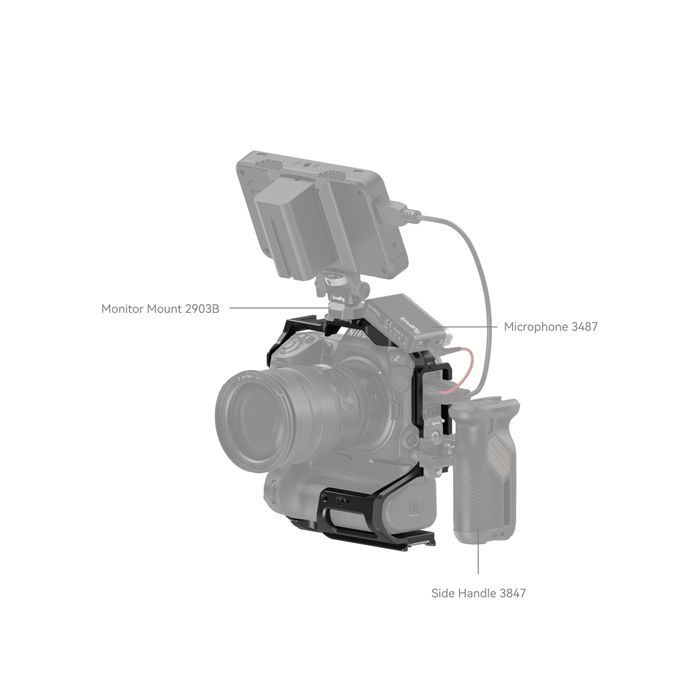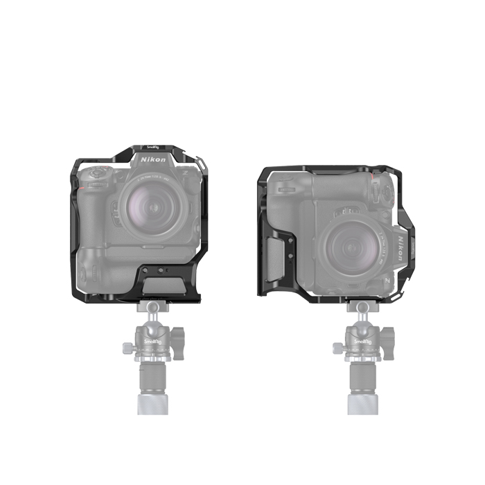 SmallRig 3982 Cage for Nikon Z 8 with MB-N12 Battery Grip is designed to protect the camera and attach accessories. It locks the camera via one bottom 1/4"-20 screw and one M2.5 screw on both sides, with rubber pads preventing scratches, and gives full access to buttons, card slots, battery door, and flip screen.