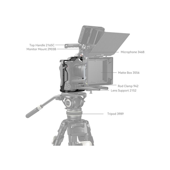 Among its accessory mounting points are 1/4"-20 & 3/8"-16 threaded hole and ARRI 3/8"-16 locating hole support to Top Handle 2165 & 1638. Side Handle 2093 & 2425, Monitor Mount 2903 & 2904 and Magic Arm 3875; two cold shoe mounts fit a microphone and LED video light and the Arca Swiss quick-release bottom plate and side plate enable horizontal and vertical shooting on tripods.